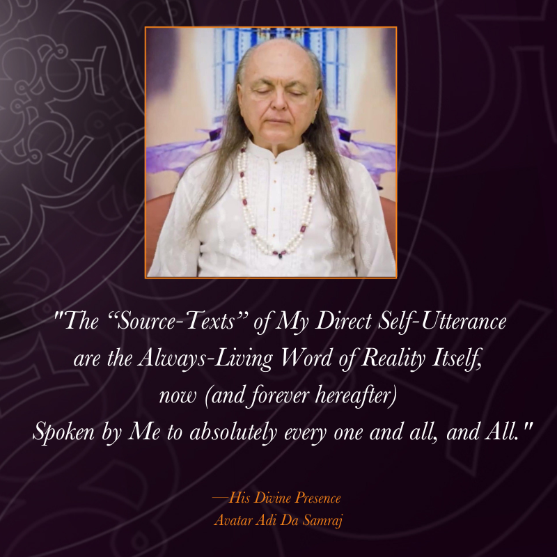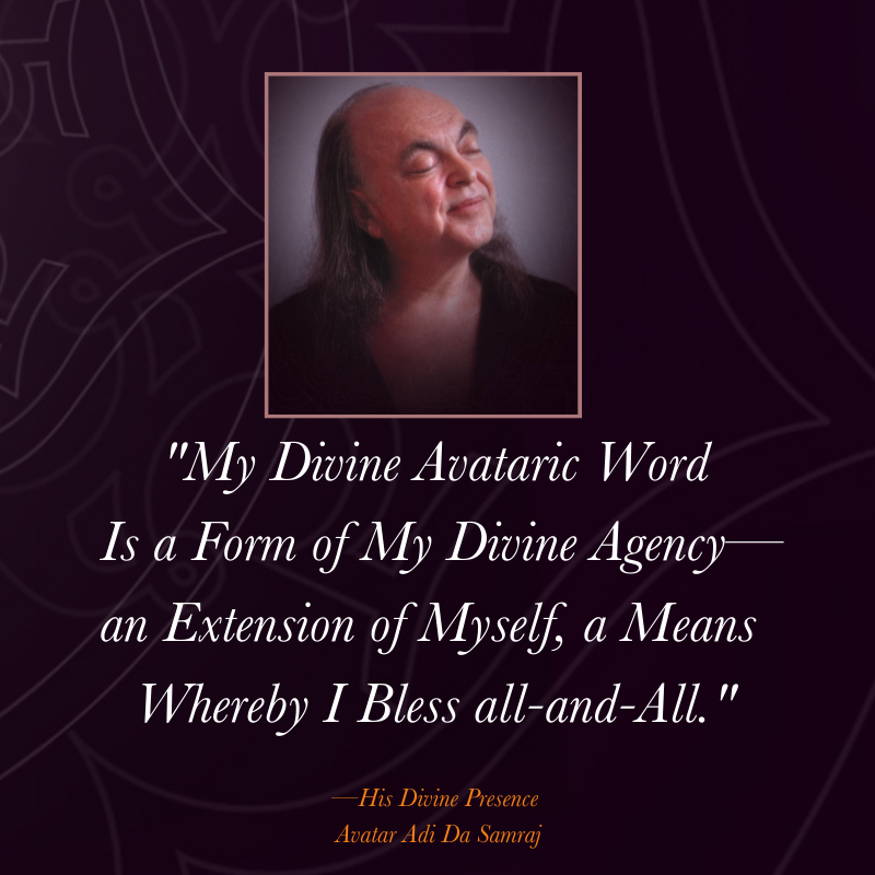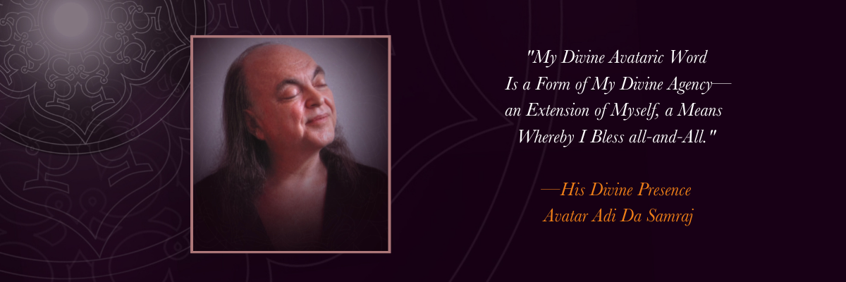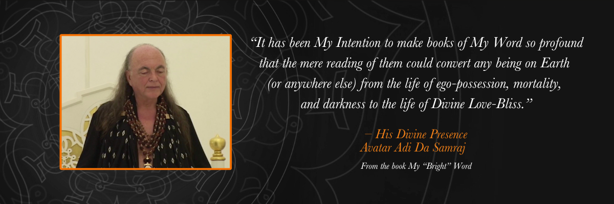 The scope and detail of Avatar Adi Da's written Teaching is unprecedented in the history of Spiritual Realisers. In more than sixty published books, Avatar Adi Da describes how every aspect of human existence can be transformed by in-depth consideration and contemplation of Reality- and simultaneously Reveals His own Divine Reality-State. Regardless of the subject matter, each of these books is an opportunity to participate in Avatar Adi Da's Communication of the Divine Reality (or Conscious Light).